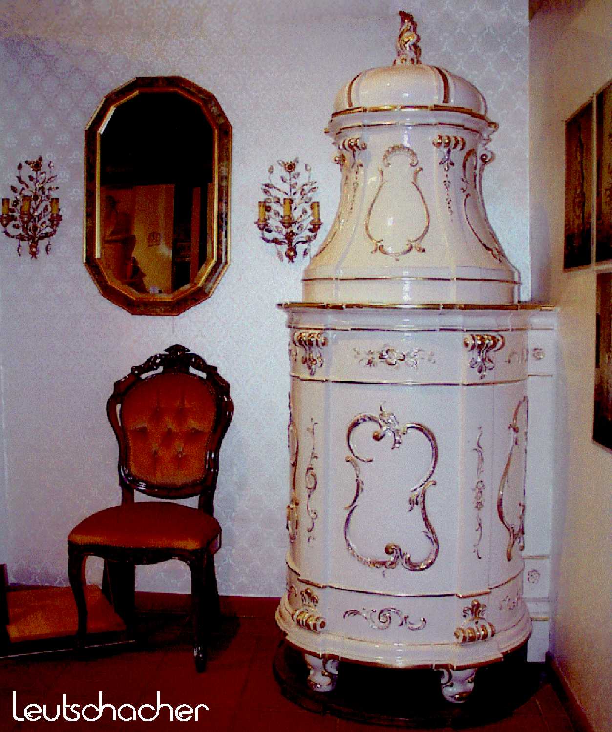 Als Dekor sind in den Kacheln stark plastische Rokoko-Spiegel aufmodelliert. Die waagerechten
