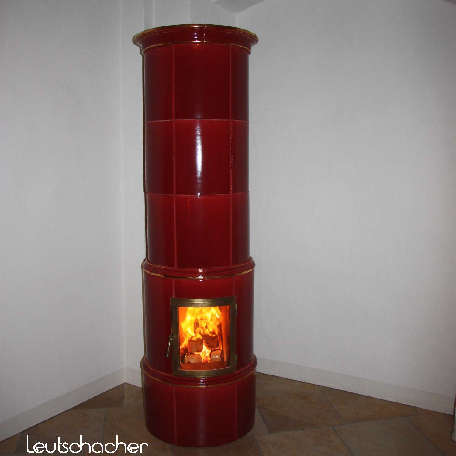Der Kachelofen wurde in einem warmen, glänzenden Rot-ton glasiert.